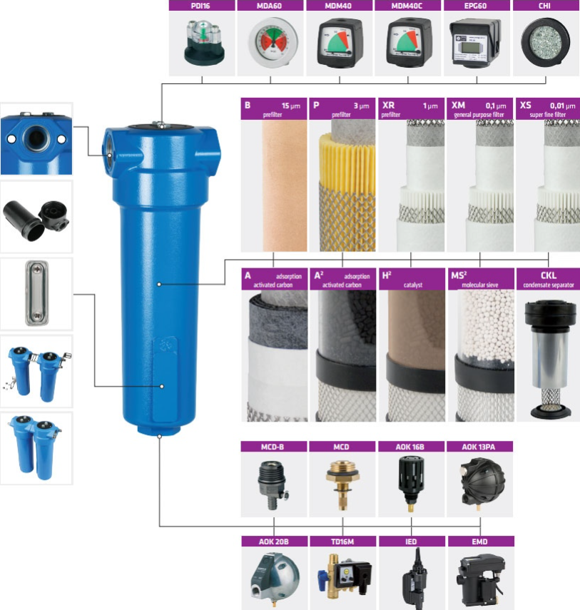Фильтры AAF предназначены для защиты последующей системы и оборудования сжатого воздуха с меньшими потоками воздуха от дефектов и других неисправностей. Они обеспечивают высокоэффективное удаление твердых частиц, воды, масляных аэрозолей, углеводородов, запахов и паров из систем сжатого воздуха до 16 бар. Необходимое качество сжатого воздуха по стандарту ISO 8571-1 может быть достигнуто с помощью 6 различных марок фильтрующих элементов (В, P, R, M, S и A). Для эффективного отвода конденсата из корпуса фильтра следует использовать внутренние и наружные конденсатоотводчики.